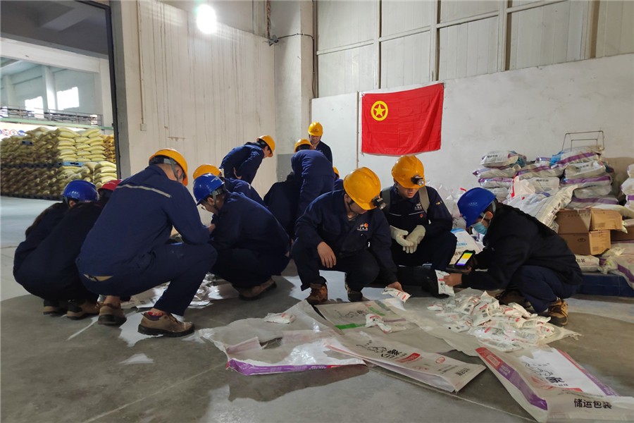 随后,矿团委组织团员青年对包装分厂破包小袋盐产品进行翻包。在包装分厂技术员的讲解带领下,团员青年们分成三个小组,对500g加碘精制食盐中包装破损的小袋盐产品进行整理剔除,同时按照生产日期、批次一致的原则对合格的小袋盐产品进行补缺并扫码装袋,大家分工协作,经过两个小时的劳动,完成了破包小袋盐产品的翻包工作。